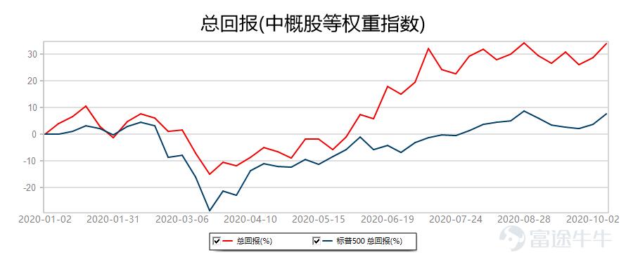 2015年1月1日以来中概股等权重指数上涨276.42%,跑赢标普500指数,相对回报率为207.54%。