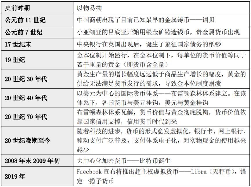 2020年,迫于监管压力,Facebook对Libra的发行机制进行了大幅度修改。截至目前,尽管离Libra的预定发行日期已过去数月,Libra离正式落地发行仍然遥遥无期。但毋庸置疑,比特币和Libra的出现推动了各国央行对法定数字货币的研发进程,将货币的虚拟化推入了新的阶段。货币的演变历史请详见表 1。