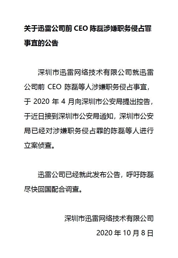 陈磊在加入迅雷六年后被前东家以贪腐起诉。10月8日,迅雷发布公告称,深圳市公安局已对涉嫌职务侵占罪的公司前CEO陈磊等人进行立案调查。