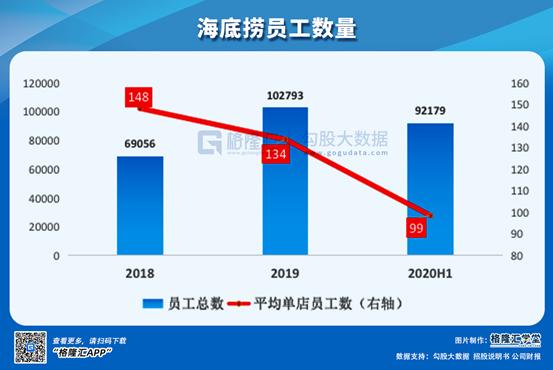 有意思的是,门店增加了20%左右,员工人数却下降了10%左右,这让截至到2020年6月底,海底捞的平均单店员工数大幅下降至99人。