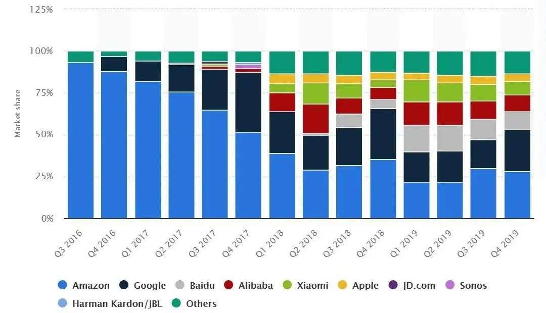 Canalys等调研机构提供的数据显示,截止至2019年底,Amazon和Google分别占据了全球智能音箱市场前二位置,阿里巴巴、小米、百度则以各超过10%的市占率位列前五。许多时候会被划分到Others中的苹果,大约占了5%不到的份额,HomePod没能“一招鲜吃遍天”。