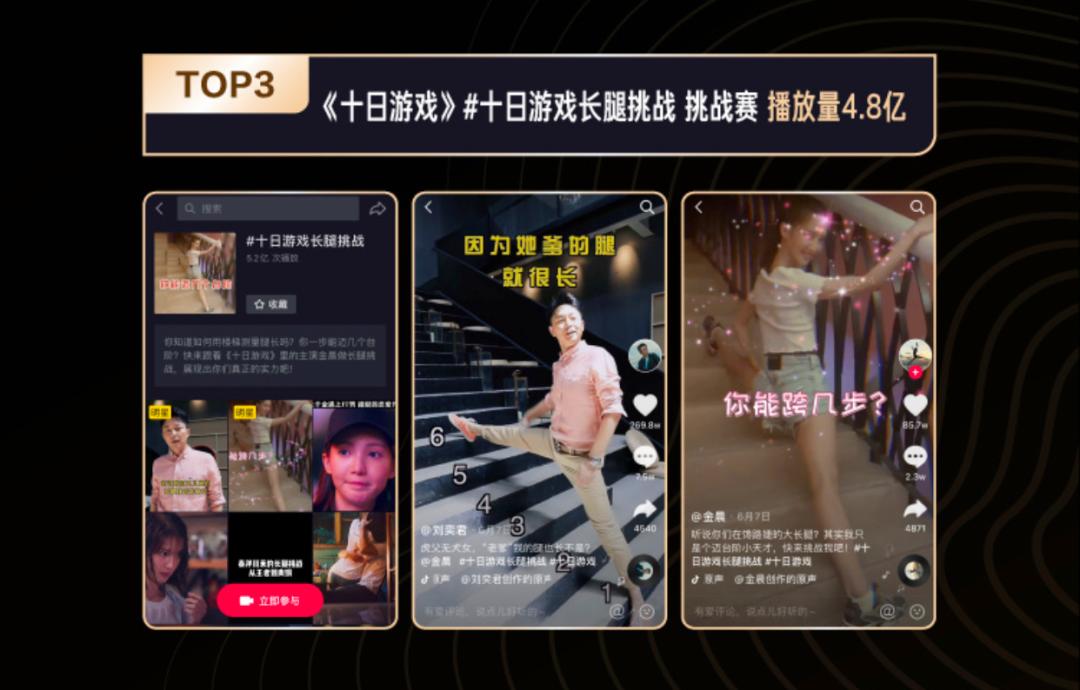 《十日游戏》则在抖音推出了“长腿挑战赛”,最终以4.8亿的播放量(现为5.5亿)获得2020年上半年抖音剧集趣味挑战赛的第三名。
