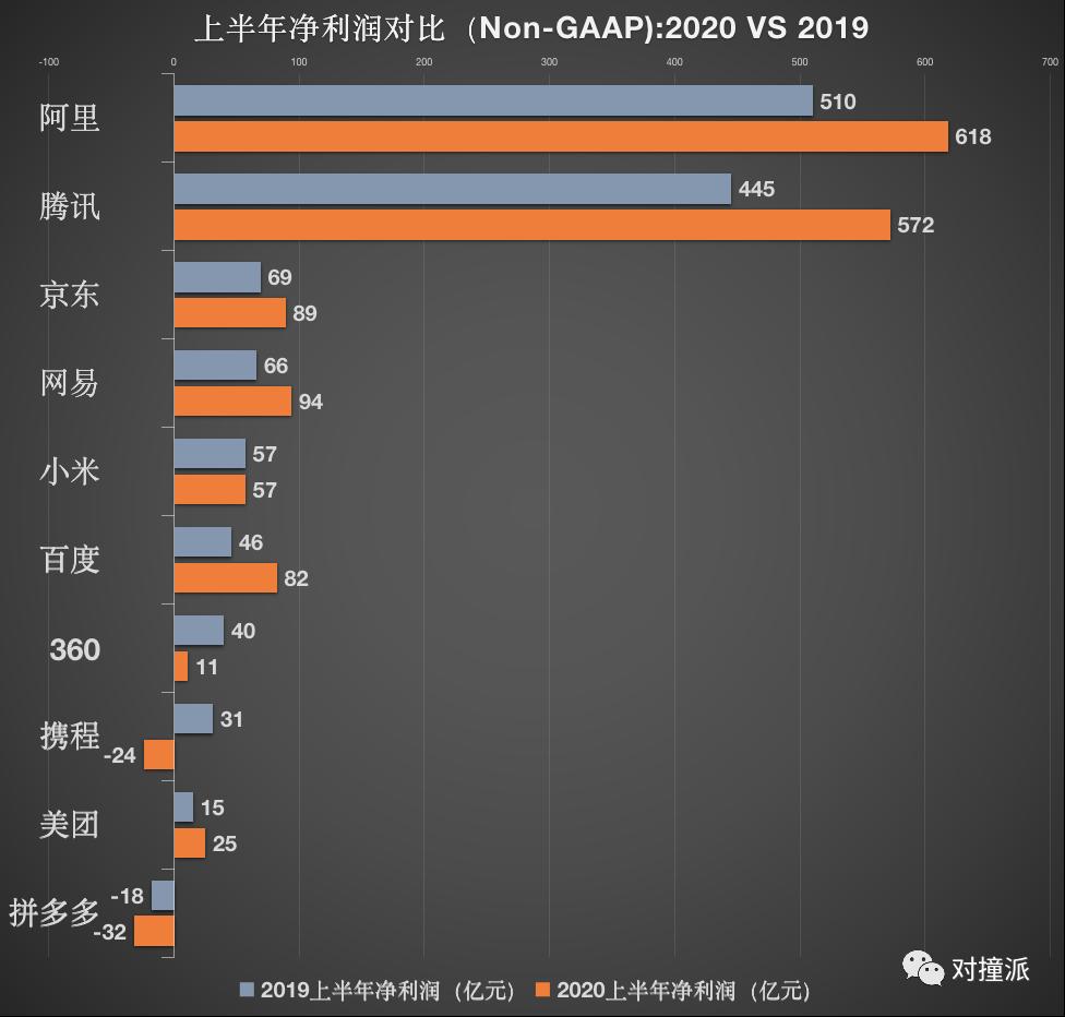 在盈利端,阿里、腾讯两家领跑,上半年非美国通用会计准则净利润分别达到618、572亿元,平均每天盈利超3亿。