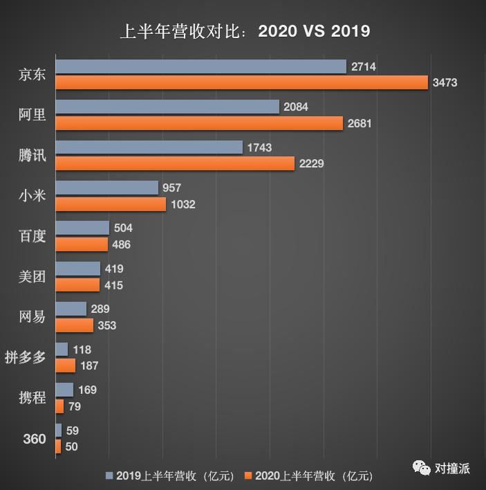 营收端,以小米(1032亿)为参照,上面京东、阿里、腾讯三家领跑,京东营收相当于3个小米,阿里、腾讯营收相当于两个多小米。值得一提的是,京东、阿里、腾讯这三家营收最高的公司,在2020上半年的增长幅度差不多,为28%-29%。