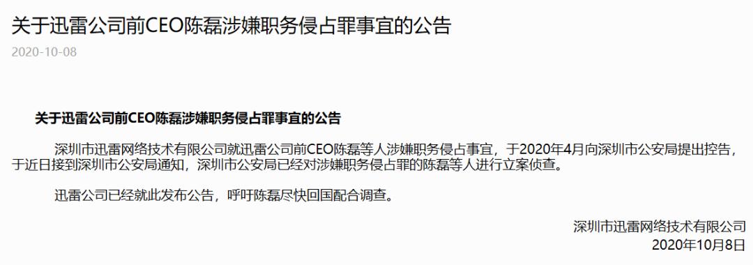 10月8号,迅雷公司发布公告称,公司前CEO陈磊涉嫌职务侵占事宜,已被深圳市公安局立案侦查,并在公告最后呼吁陈磊尽快回国配合调查。