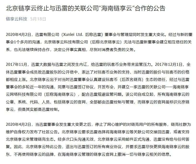 后来北京链享云发布公告表示,北京链享云与迅雷签订协议、开发布会、并建立一家迅雷的关联公司――海南链享云,配合迅雷规避监管问题。自海南链享云公司自成立起,所有海南链享云的公章、系统、代码、人员、包括链享云的官网,全部都由迅雷控制与管理,而链享云的官网虽标识北京链享云,但其实都是迅雷控制。