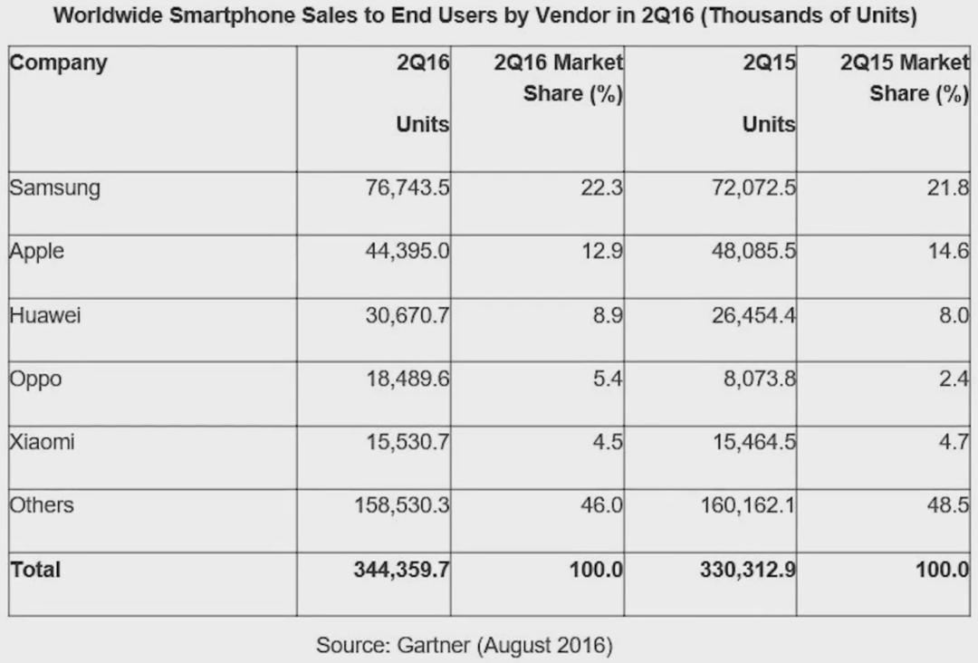 2016年第二季度,根据Gartner数据显示,三星、苹果销量遥遥领先,华为以3000万部销量稳居国内厂商第一位。这段时期的国产手机市场迎来了新的“华米OV”四强争霸的时代,而这一局面也一直延续到了今天。