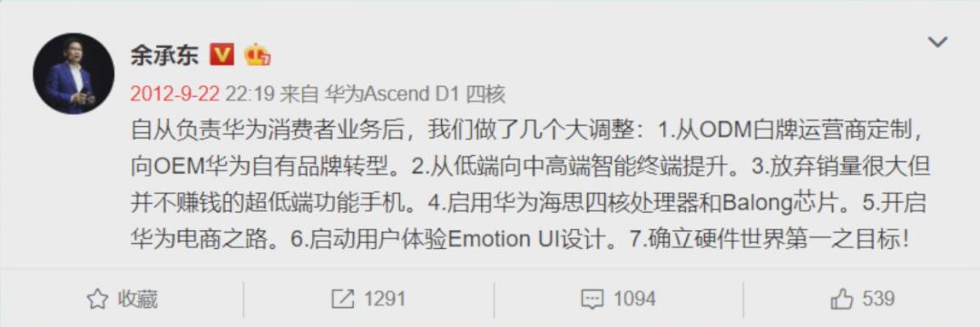 2011年,伴随着华为消费者事业部的成立,余承东成为了扛旗的大将,接任消费者业务CEO、华为终端公司董事长。自他上任后,华为直接砍掉了年销量3000万的白牌运营商定制机业务,主攻智能手机。