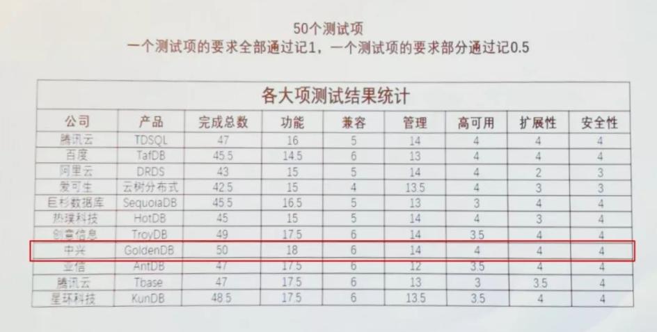 在6月初举行的2019 BDIC大会上,中兴通讯的GoldenDB数据库获得了全部50项测试满分的成绩,是当时参与测试的唯一获得全满分的厂家,力压百度、阿里、腾讯等科技巨头。