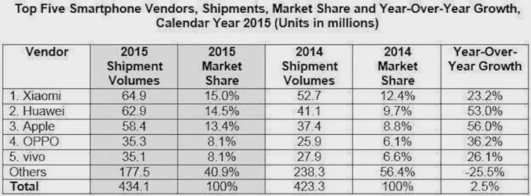 ▲2014到2015年中国智能手机市场出货情况