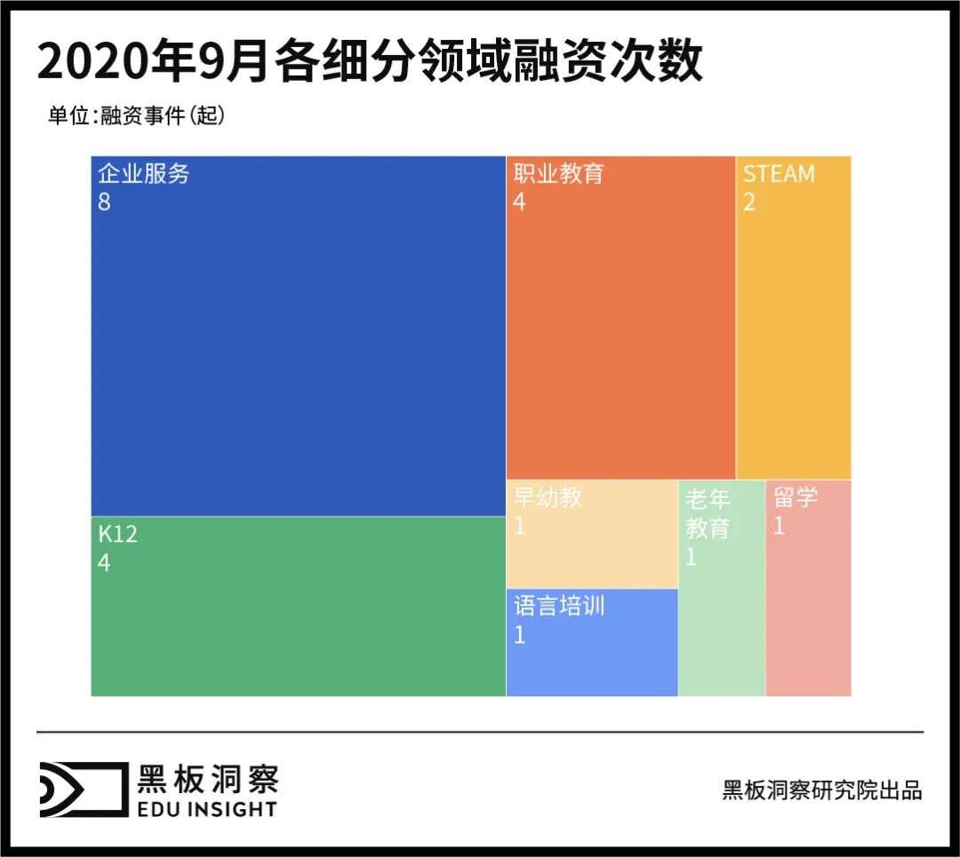 9月融资事件细分领域中,教育企业服务赛道融资8起,位居本月细分领域融资数量榜首。K12、职业教育赛道融资事件各发生4起。STEAM赛道融资事件1起。