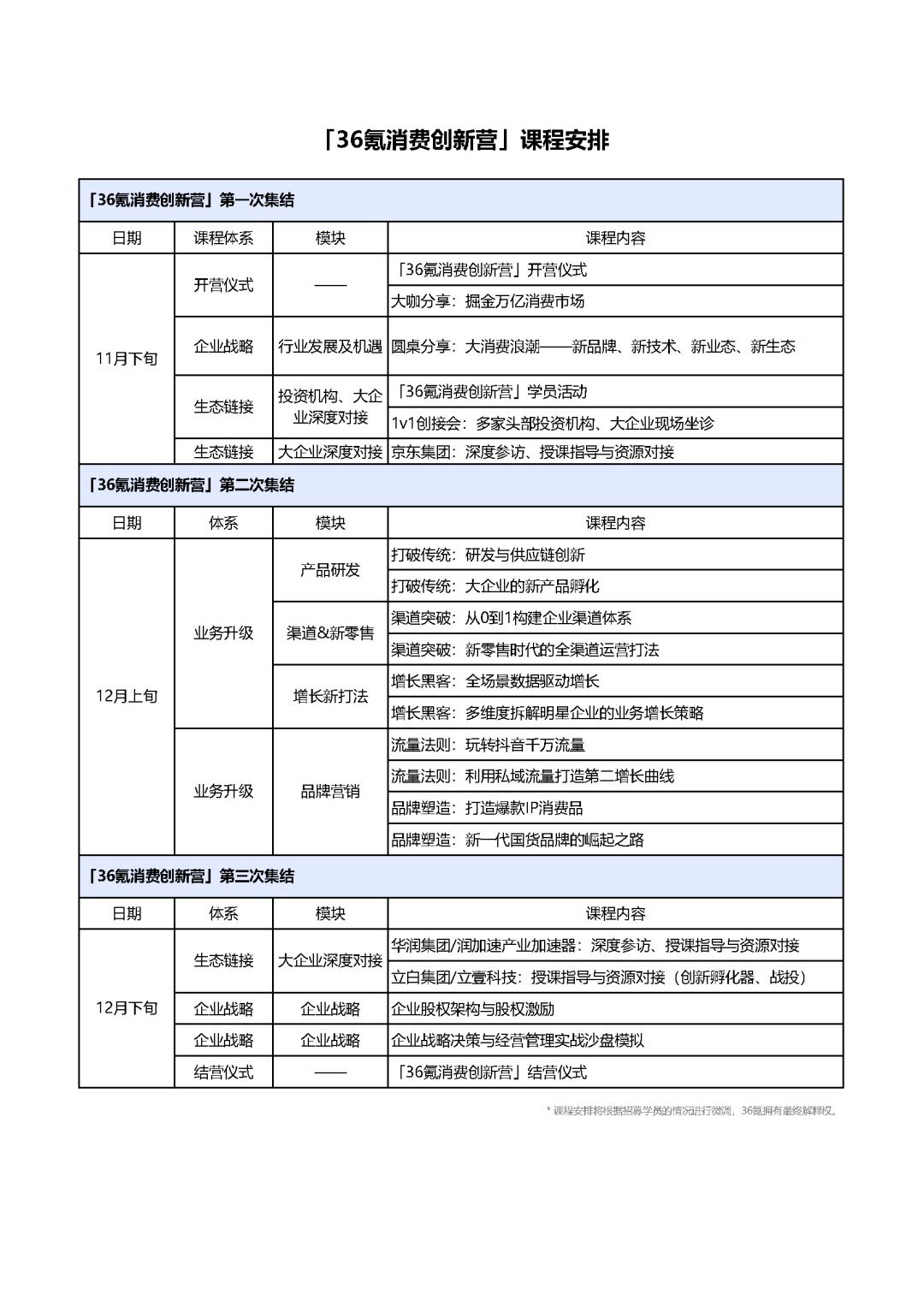 「36氪消费创新营」计划为期6个月,初期,持续招募遴选优质创新创业项目,完成高质量、强针对性的课程设计和研发;中期,创新营通过3次集结,安排行业顶级大咖授课、企业深度访学、业务资源对接等形式,高效链接,加速项目成长;收尾期,将收集消费创新营的成功合作案例,充分利用36氪和《未来消费》媒体的优势,展示落地成果,扩大影响力。