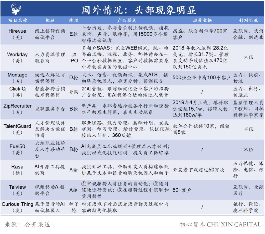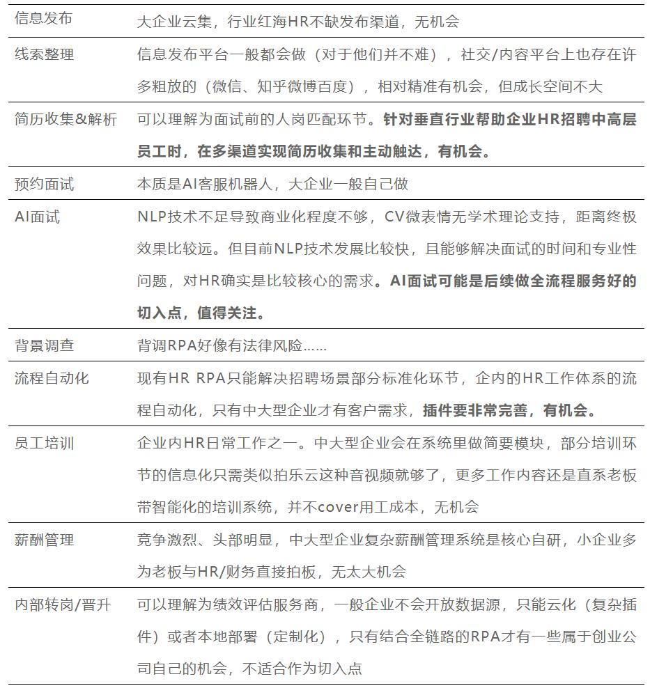 总的看来,对于新的创业公司来说,机会主要集中在简历收集&解析、AI面试和流程自动化上。从中找到好的切入点之后再延伸做全链条服务对于创业公司来说是可行的发展路径。