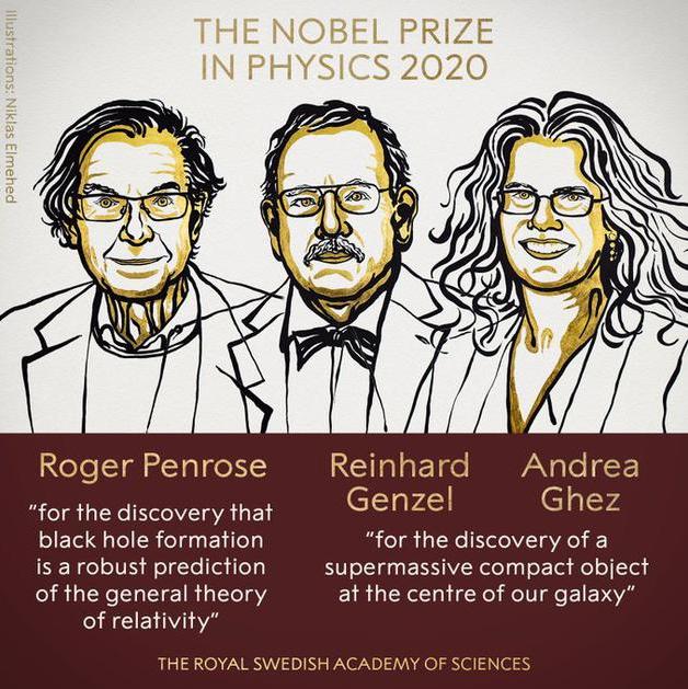 2020年的诺贝尔物理学奖授予了对黑洞的理论和观测做出重要贡献的三位科学家,一半授予彭罗斯(Roger Penrose),奖励他发现黑洞的形成是广义相对论的普遍(robust)预言,另一半授予根策尔(Reinhard Genzel) 和盖兹(Andrea Ghez),奖励他们发现银河系中心的超大质量致密物质。