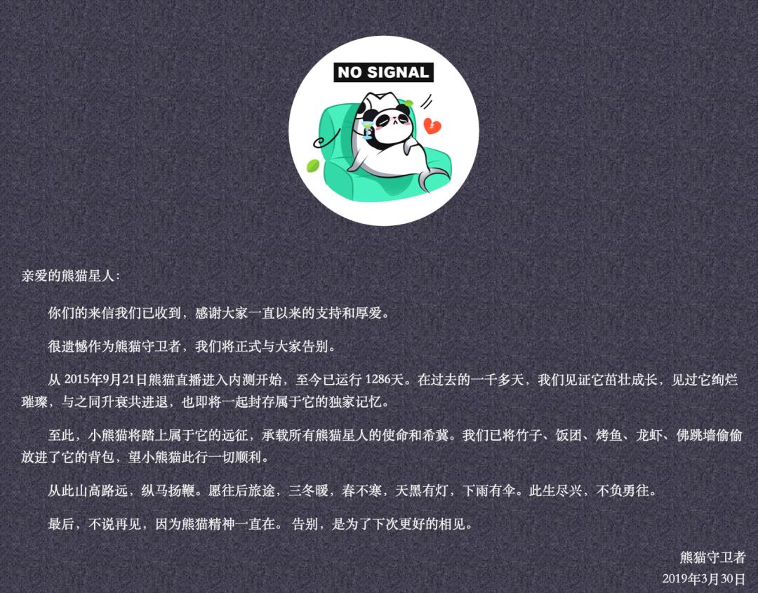 2019年3月底,熊猫直播正式停止服务。曾有熊猫直播的主播告诉刺猬公社,直到关站时,他也没收到拖欠已久的数千元工资。