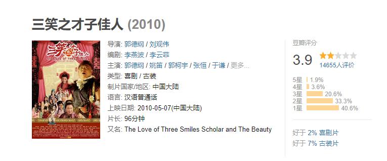 而在2014年,郭德纲和于谦参演的电影《大话天仙》也以2962万元收入票房惨败,而最让郭德纲郁闷的是这些电影的口碑低迷,在豆瓣上两部电影评分分别为3.9分和3.2分。