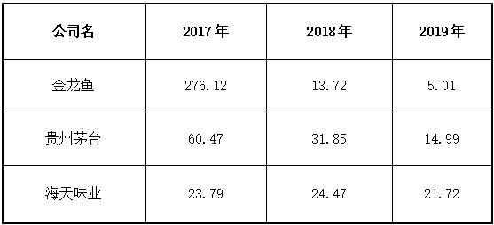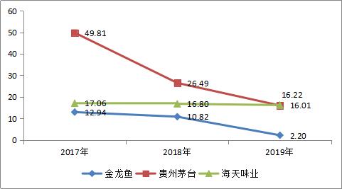 从收入增速来看,最近3年来,贵州茅台的平均营收增速为30.77%,其中2017年增速高达49.81%;海天味业的最近3年营收增速为16.69%,3年的营收增速均在17%左右,增长平稳;而金龙鱼的这3年营收增速平均值仅为8.65%,特别是2019年,其营收同比增速仅为可怜的2.2%。