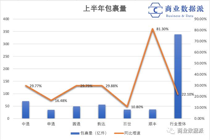 如果分析目前的市场快递业务的增速来看,圆通的增速不低于行业水平,根据国家邮政局数据,今年上半年全国快递服务企业业务量累计完成338.8亿件,同比增长22.1%,而超过行业增速的快递公司有四家,除了顺丰以81.3%的增速遥遥领先以外,中通、圆通、韵达的增速都接近30%。