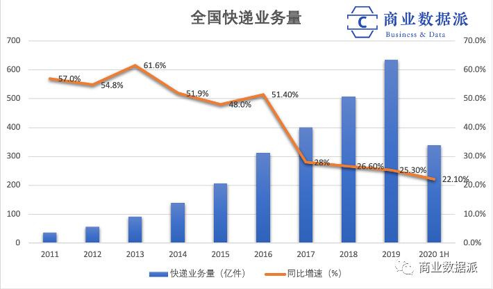 快递市场的格局,正在悄然发生改变。根据国家邮政局数据,全国快递服务企业业务量的增速从2016年达到51.4%的顶峰后,就一直在缓慢下跌,而在今年上半年,这一数据已经降至22.1%。随着电商市场逐渐成熟,即便排除Q1的疫情影响因素,这一增速也难以回到之前40%至50%的水平。
