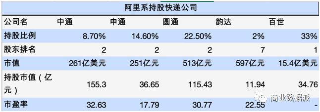 9月21日,申通再获阿里巴巴增持,阿里巴巴将间接获得申通快递10.35%的股份,累计间接持有申通快递上市公司25%的股份。9月1日晚间,圆通速递发布公告称,阿里巴巴以每股17.406元的价格,向圆通收购3.79亿股,占股份总数12%,涉资66亿元,收购完成后,阿里巴巴将持有圆通22.5%的股份。