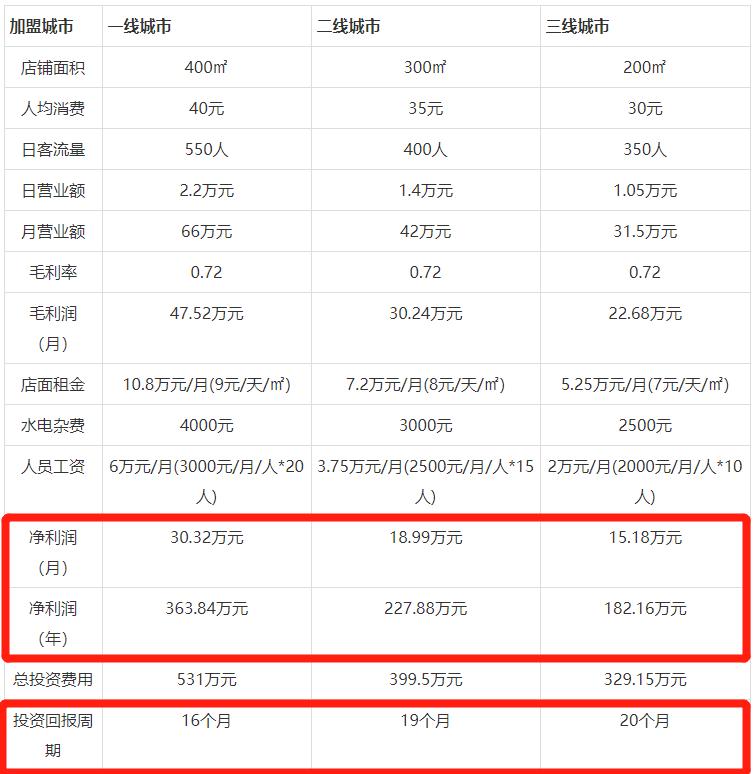 在肯德基官网上有一份这样的数据,像省会城市下面的3线城市,预估会在20个月之后开始回本。