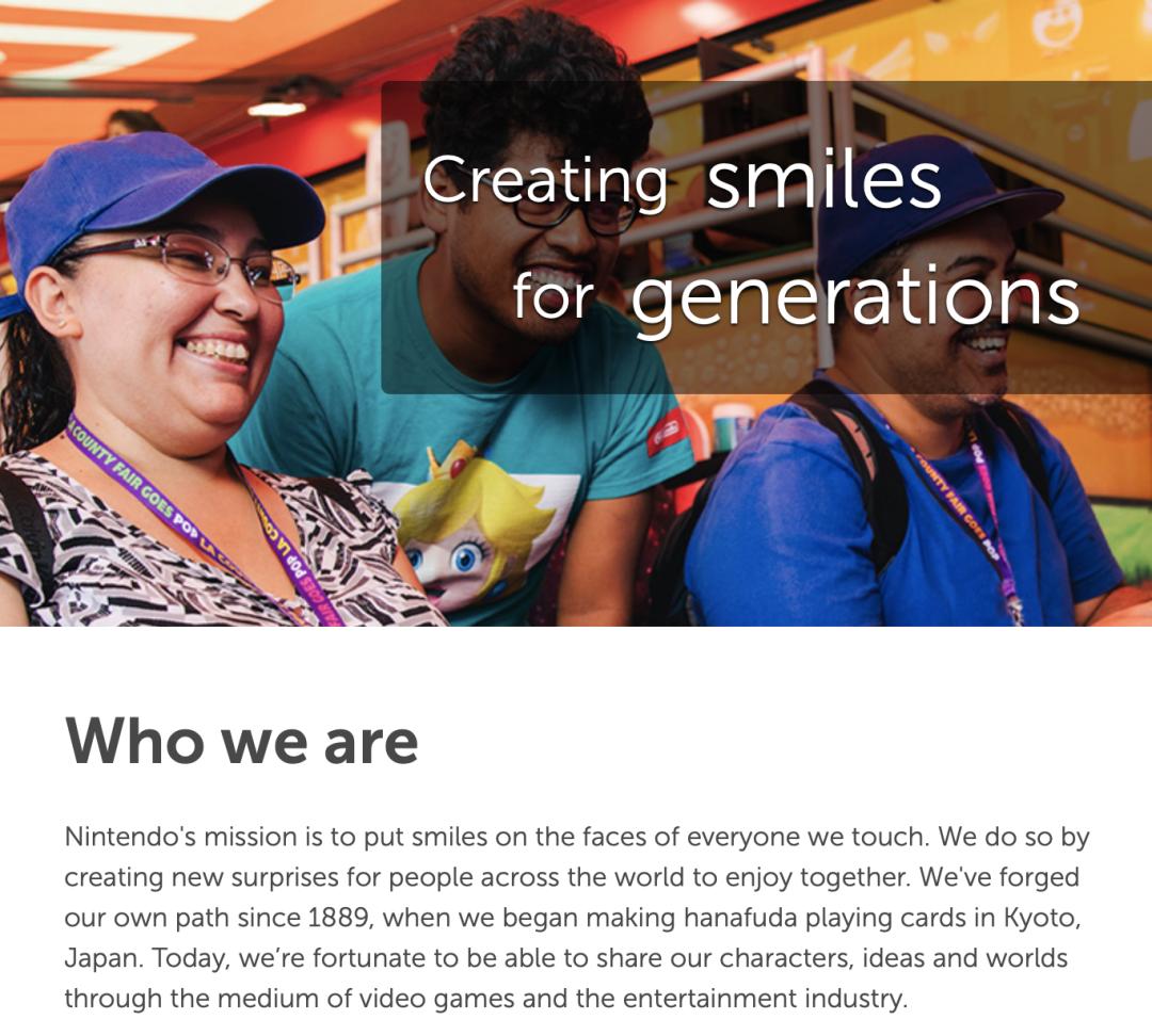 任天堂官网左下角有个「about us」的 link,点开后会发现它藏起来的小心思——Creating smiles for generations。