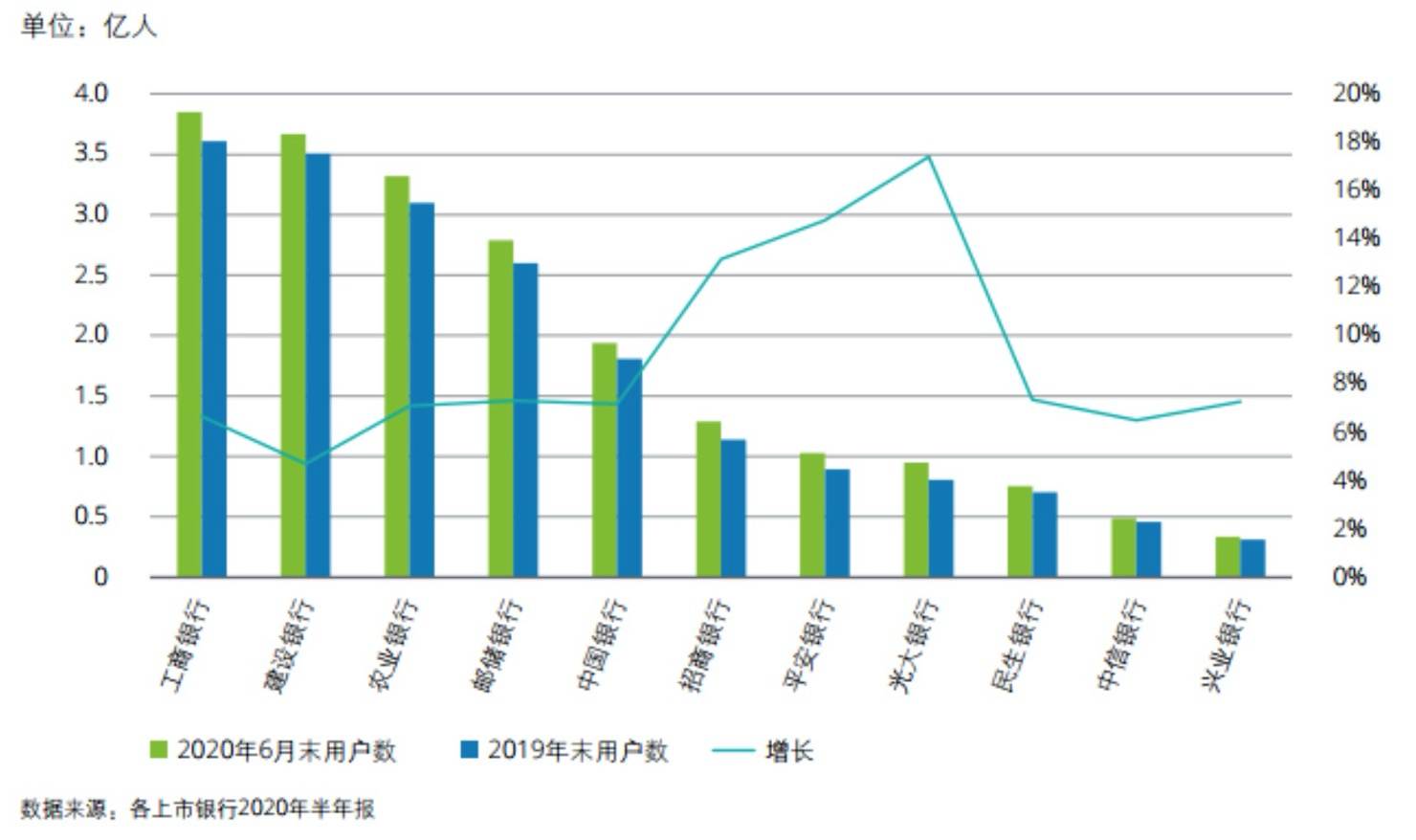 10月10日,德勤发布《2020年上半年中国上市银行分析——中流击水,奋楫者进》报告,指出2020年大部分上市银行抓住了疫情带来的“机遇”,加速数字化转型,加大新产品开发创新,加速引导业务线上化,增强业务活力。根据半年报披露,11家上市商业银行用户总数超过20亿(其中交通银行未披露银行用户数),较去年年末均有较大幅度提升,总提平均增幅达7.77%。