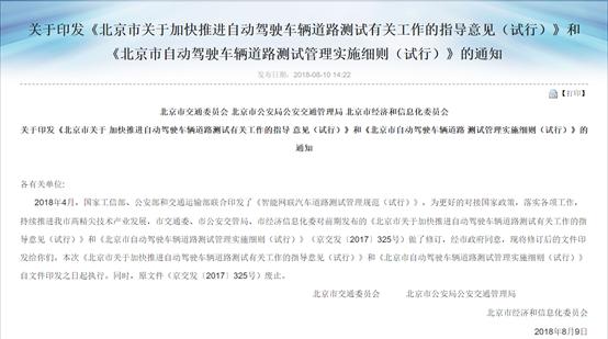 智能网联汽车道路测试管理规范(试行)》条例发布,图源北京市交通委员官网