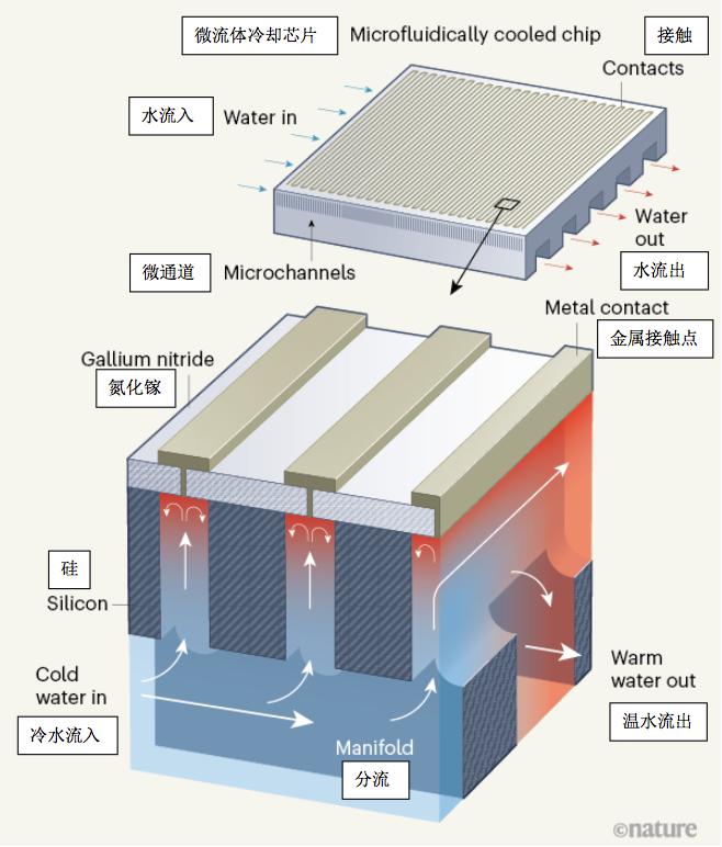 提升电子系统性能的一个高效又节能的策略是将微流体冷却通道集成到芯片中,以防止芯片过热。然而,此前设计并构建的最先进的微流体冷却系统却是独立于电子芯片之外的,妨碍了将通道集成到电路中为热区提供直接的冷却。由于这种集成会显著增加芯片制造的复杂度,成本也会相应提高。van Erp等人[1]在《自然》上发表论文,报道了一种集成微流体冷却系统的电子设备,让微流体冷却系统与电子元器件紧密结合,并且采用一种单次的低成本工艺流程进行构建。