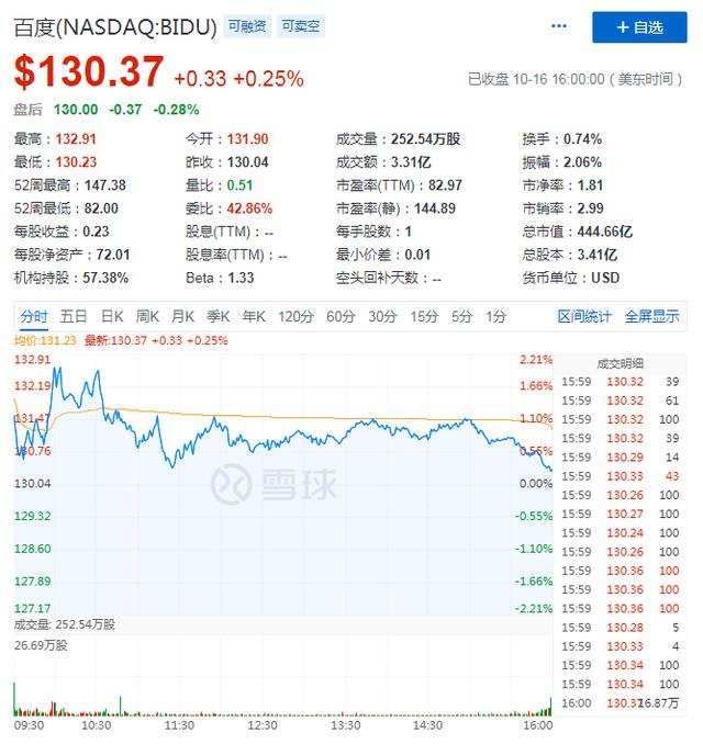 或受该消息影响,百度股价曾在10月14日开盘拉涨,该股曾一度涨7.19%。截至目前,百度周五收盘股价为130.37美元,市值为444.66亿美元。