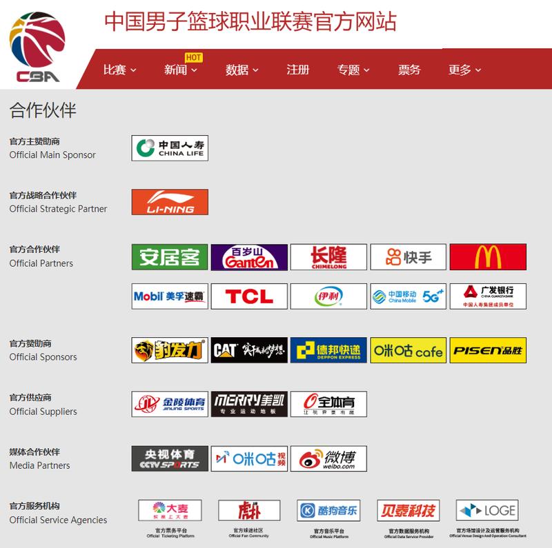 目前CBA拥有28家合作伙伴中,主赞助商为中国人寿,官方战略合作伙伴依旧为李宁,官方合作伙伴由2019-2020赛季初的7位增至10位,其中百岁山回归,伊利、麦当劳和中国移动早些时候加入队列,携程旅行退出。