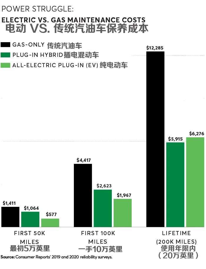 《消费者报告》对比电动汽车和传统汽油车的保养费用