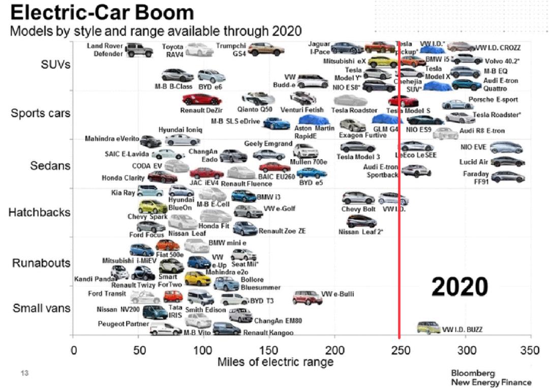 红线处为2020年市面上续航里程数在250英里的电动汽车 图片来源:彭博社新能源财经
