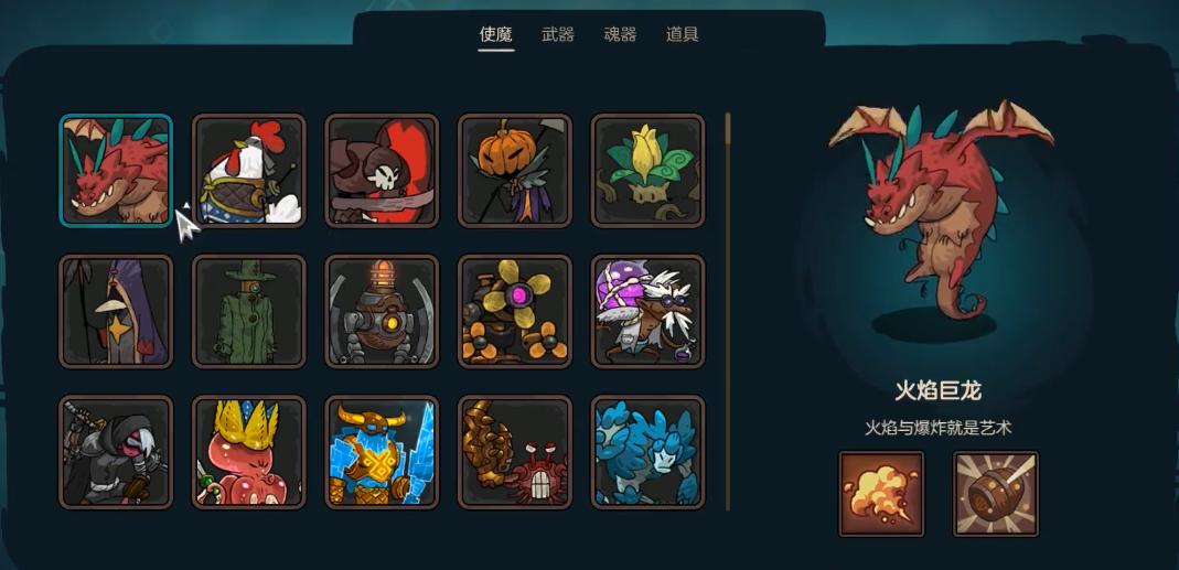 其三是使魔,玩家在第一次击败使魔后便会解锁对应技能,可以选择搭载最多两个使魔,即四个技能。这些主动技能与武器、魂器的被动技能效果相结合,又能产生许多化学反应。