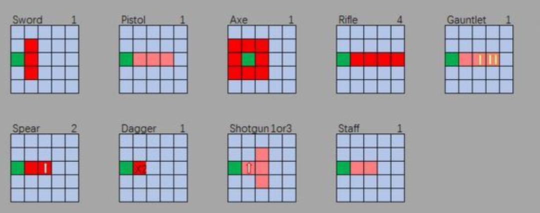经过他们的设计,可以看出游戏在流派Build上,至少存在3个关键维度。其一是武器,其种类分为九种,有各自的攻击范围,并根据距离长短附带平衡设计。例如火铳距离最长,使用时作为限制需要手动换弹,相当于主角时不时要被禁攻一回合;匕首距离最短,使用时作为补偿,自带双重攻击;而拳套这种中等距离的武器,在最远处往往也有额外效果。