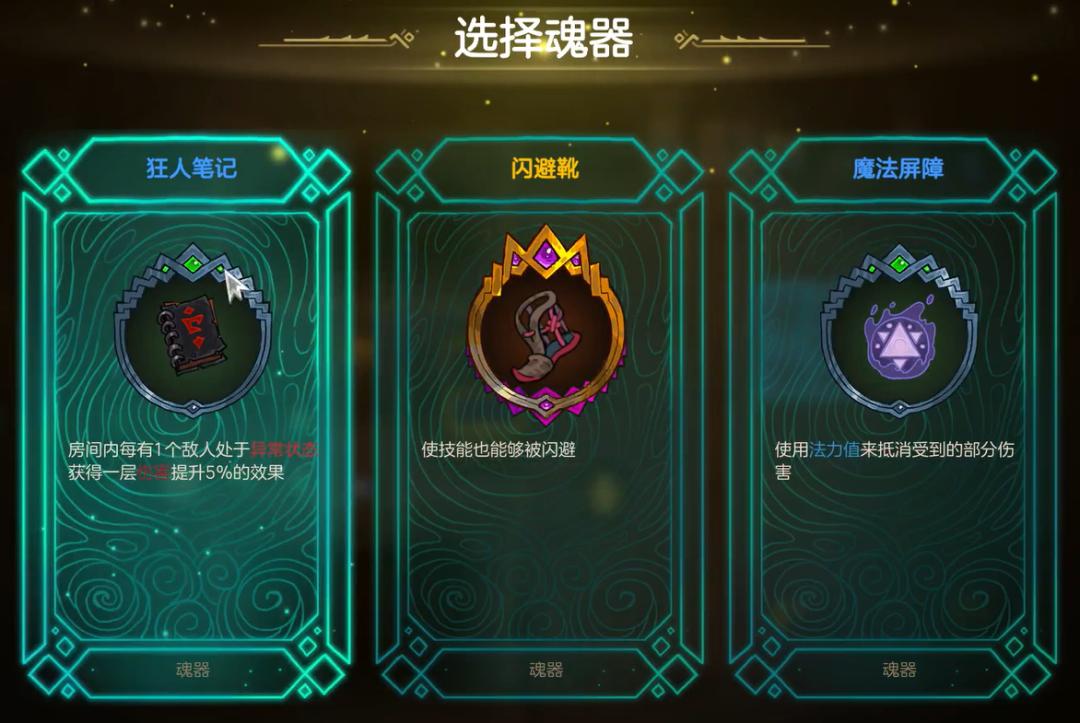 其二是魂器,相当于其他Roguelike游戏中的“遗物”。它们同样具有品质之分,并且往往带有一些影响深远的加成效果,能在一整局内持续作用。