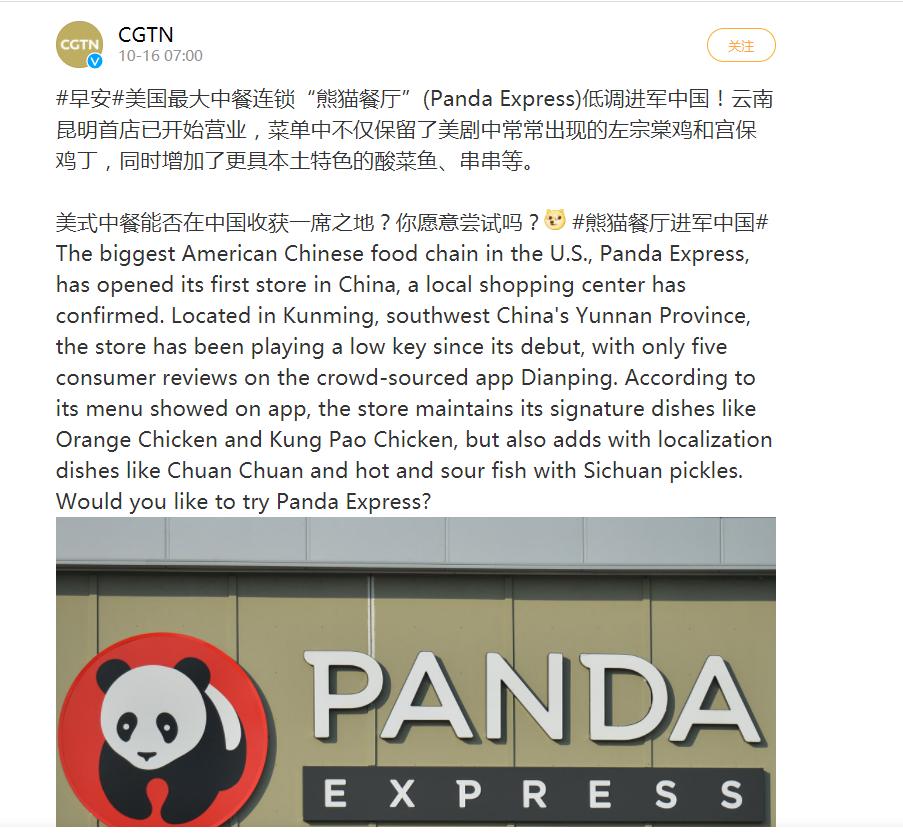 近日,多家媒体报道,美剧里频繁出镜、源自美国的全球最大中式快餐连锁“熊猫餐厅”(Panda Express)进入中国,在云南昆明开出首店。