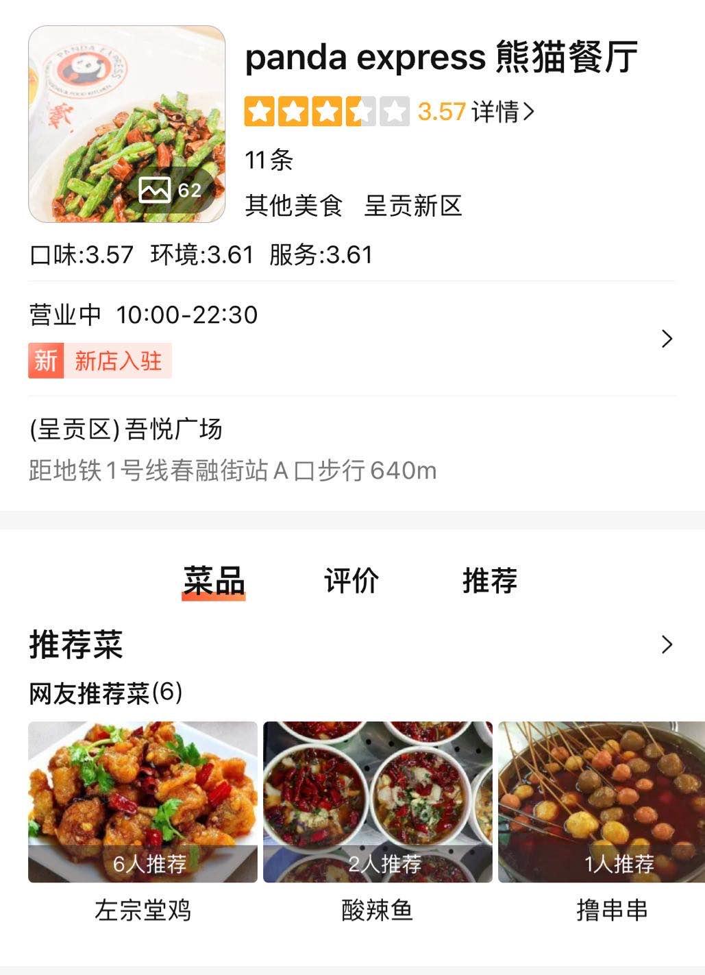 每经小编查询大众点评发现,确有一家“panda express熊猫餐厅”入驻了云南省昆明市呈贡新区的吾悦广场。