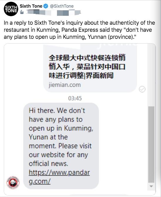 此外,据澎湃新闻英文版SixthTone报道,Panda Express就在昆明开店一事回复称:“我们目前没有任何在云南昆明开店的计划。”