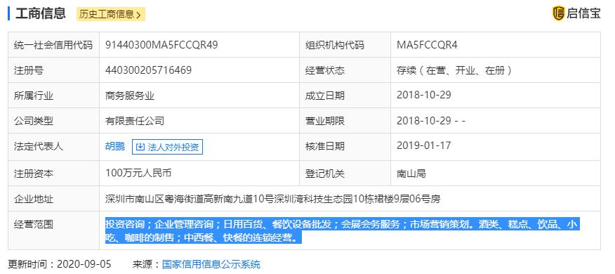 启信宝资料显示,深圳禧桂福餐饮管理有限公司成立于2018年,法定代表人为胡鹏。经营范围包括:投资咨询;企业管理咨询;日用百货、餐饮设备批发;会展会务服务;市场营销策划。酒类、糕点、饮品、小吃、咖啡的制售;中西餐、快餐的连锁经营。