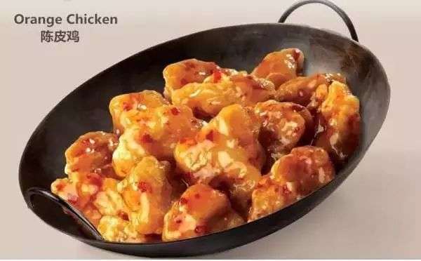 鸡块裹着面糊油炸之后蘸着酸甜的酱汁吃,由于在调料中加入晒干之后的橘子皮,因此得名“陈皮鸡”,口感酸甜微辣,深受美国人欢迎。很像糖醋里脊,只是多了橘子香和辣味。