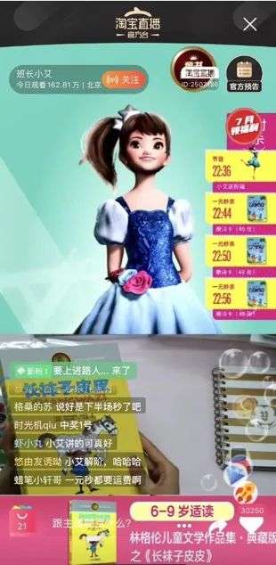 因此,班长小艾的淘宝直播间人气颇高,单场直播最高观看量突破162万。作为站内新奇特频道的主推选手,她曾和出版社合作推出童书专场,以超低价秒杀卖出《美女与野兽》周边文创,颇有成为虚拟圈“薇娅”的潜质。
