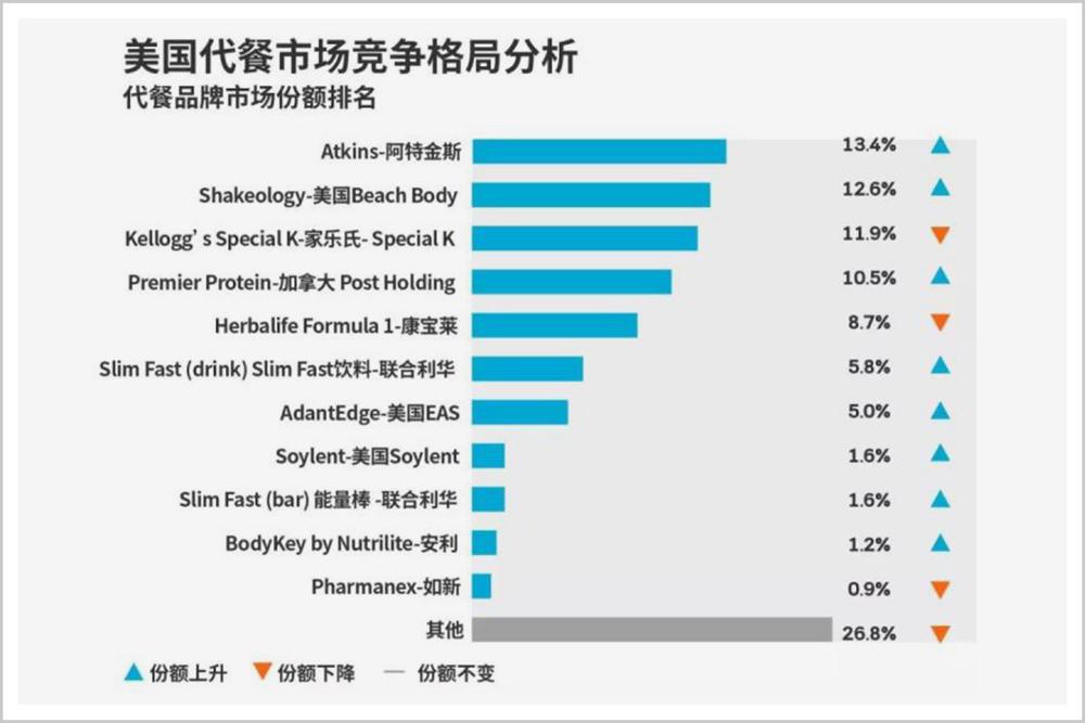Global Industry数据显示,2018年,美国代餐市场规模已突破200亿美元,此后到2025年,还将以6.64%的年复合增长率持续成长。