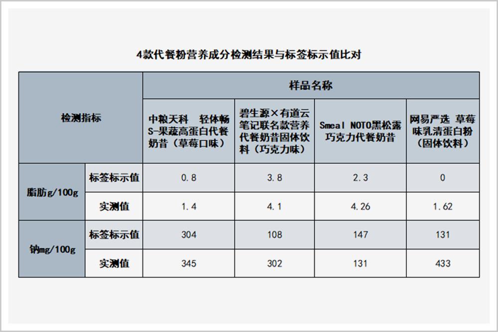 深圳市消委会发布的《2020年轻食代餐粉比较试验报告》显示,中粮天科、Smeal、网易严选、碧生源四款代餐粉的部分营养指标,实测值与其标示值不符,未达到GB 28050-2011《预包装食品营养标签通则》的要求。