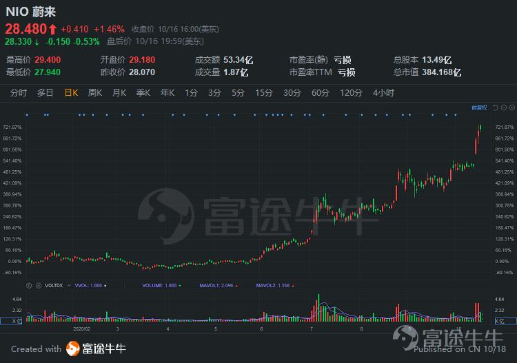 1、蔚来股价在本周三(10月14日)飙升近23%,周四周五继续刷新上市新高,周五收盘报28.48美元/股,目前市值384.20亿美元。