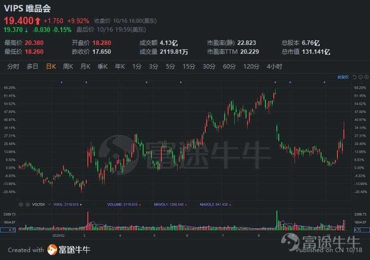 2、周五唯品会收盘上涨9.92%报收19.40美元,市值131.14亿美元。
