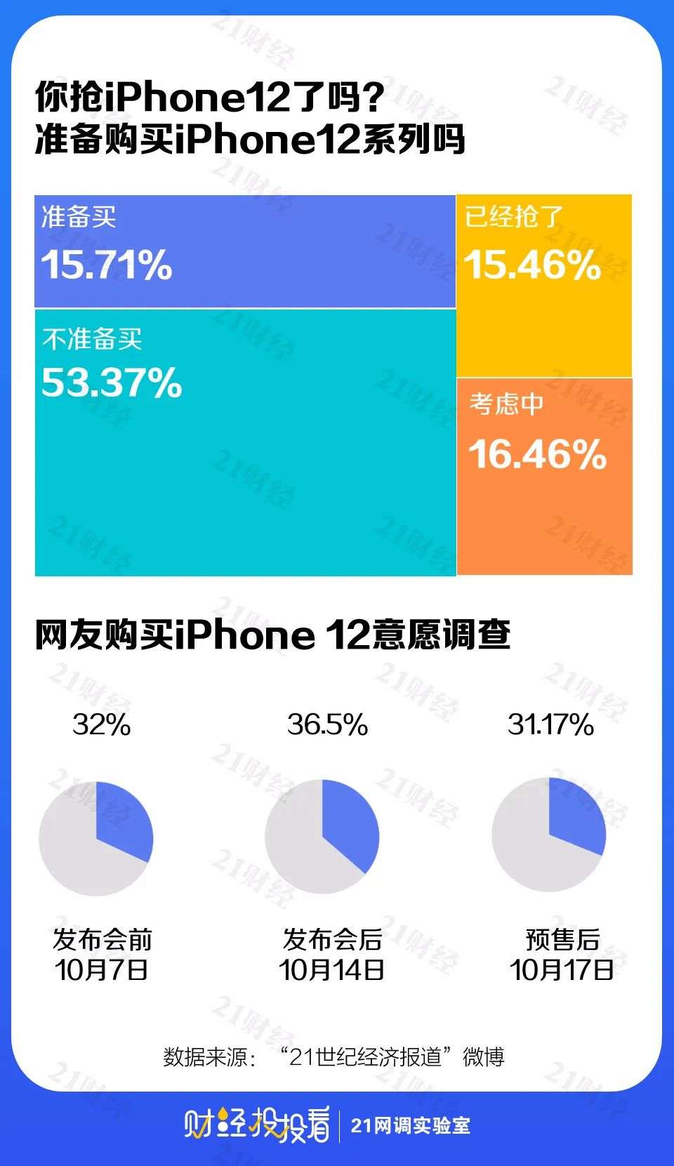 iPhone12系列预售看上去一片火热。当晚,2万多网友参与了21网调实验室的投票,其中有31.17%的网友表示买了或准备买,53.37%的网友则明确不买,16.46%还在考虑中。