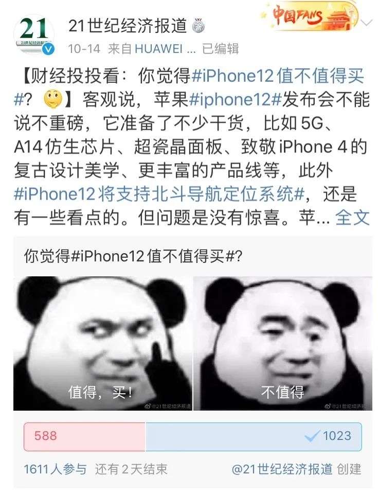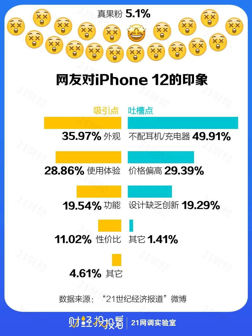 有网友甚至在微博上喊话:“我就是苹果脑残粉,苹果就是一直被模仿从未被超越,不服你就闭嘴。”据21网调实验室的统计,5.1%的网友认为iPhone 12就是“完美”的,无可吐槽之处。