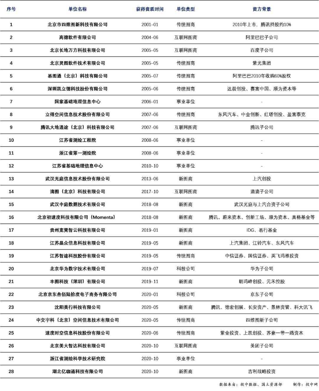 投中网统计发现,2017年之前仅有13家图商获批导航电子地图制作资质,除了4家基本不参与民间商业活动的国家事业单位,BAT分别控制1-2家,其余大多是与互联网公司或者车企合作的传统图商。