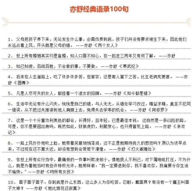 金句多。只要看过亦舒小说的,谁都不会忘记。她的金句多到网上还有专门的总结她的金句汇总。